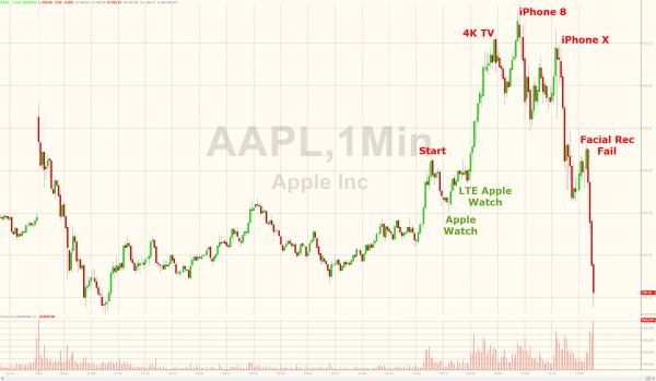 iPhone X發(fā)貨時間公布后,蘋果股價進(jìn)一步下行,日內(nèi)跌幅一度超過1.6%,后跌幅收窄,當(dāng)天收跌0.42%。而在發(fā)布會開始后,蘋果股價還曾抹平日內(nèi)跌幅轉(zhuǎn)漲,一度漲逾1%。