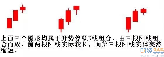 升勢停頓與紅三兵走勢有相似之處,與曾經講解的升勢受阻技術圖形基本相同,同樣由三根陽線組合而成,前兩根陽線走勢相對凌厲,拉長陽線或中陽線上攻,而第三根陽線實體,一下子縮短的很小,似乎股價原來的上升動能要停頓下來,故稱之為升勢停頓K線組合。