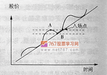 假如這是一個正常的升勢,A、B 點分別是波峰和波谷。一旦股價超過A 點,便是好的買入點。假設A=15 元,B=13 元,則好的買入點是15.10元或15.50元。因為你可以斷定這是新一波的開始。假如股價升到16.5 元,你便可將賣出價定在15.50元。記住保本。如果繼續上升,你便應忘掉入場價,專注于股票運動是否正常。止損點應怎么定呢?有兩種方法:第一,A=15 元,把止損點定在14 元;第二,B=13 元,把止損點定在13 元。這看你對風險的承受力。但無論如何,股價跌穿B點必須走人。記得升勢的定義嗎?正常的升勢應該一浪高過一浪,如果股價高過A但隨即擊穿B,表示升勢已被暫時否定。你必須在場外觀望,重新尋找機會。
