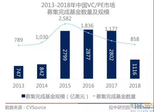 據投中研究院報告,2018年,國內VC/PE機構募集完成基金共858支,同比下降約27%,募集總規模約為1116億美元,同比驟降約6成,均為近4年來最低。