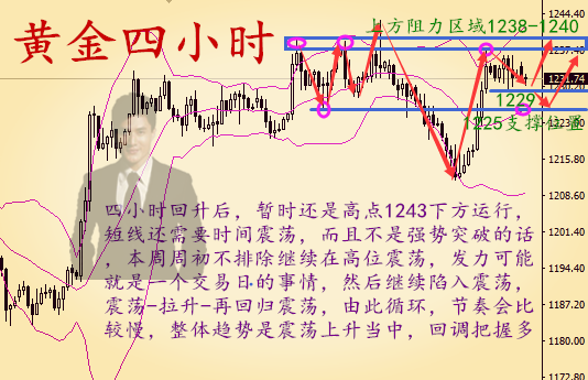 四小時回升后,暫時還是高點1243下方運行,短線還需要時間震蕩,而且不是強勢突破的話,本周周初不排除繼續在高位震蕩,發力可能就是一個交易日的事情,然后繼續陷入震蕩,震蕩-拉升-再回歸震蕩,由此循環,節奏會比較慢,整體趨勢是震蕩上升當中,回調把握多。比較理想的多單進場位置仍在1225一線,但是強勢整理的話,可能會踏空點位,所以亞歐盤若是一直維穩在1229上周五低點上方,則盤中可以進多一次。切忌追漲殺跌,投資本是錦上添花之事,濤赫希望各位朋友都能夠開開心心賺錢,輕輕松松盈利,少一些疲累,多一點收益。