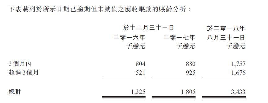 進入2018年,截止8月31日,集團逾期應收賬款金額進一步增長90.19%至343.3萬港元,不僅高于同期應收賬款增速,逾期賬款在應收賬款中的占比也提升至26.35%。