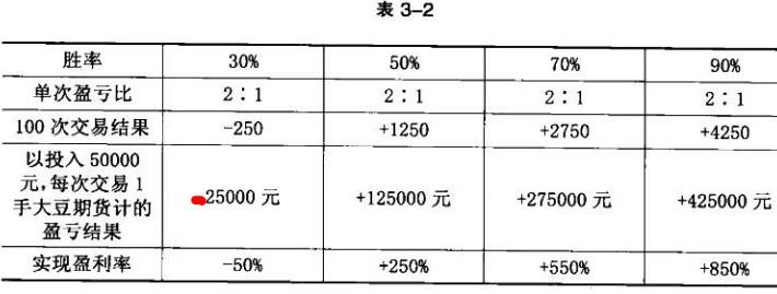 從表3-2可以看出,以同樣的盈虧比,100次交易的結果,如果成功率只有30%,則會造成50%的虧損,但成功率提高到50%以上,則會產生高額回報,達到250%回報,當成功率達到90%時,冋報率高達850%。